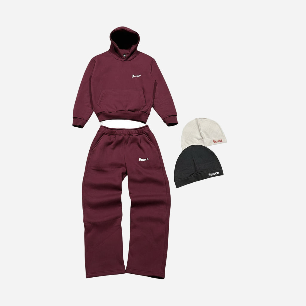 Scopri la tuta Sauce in colorazione bordeaux: calda, morbida e ultra-comoda. Realizzata in cotone premium, offre vestibilità rilassata, cappuccio strutturato e pantaloni wide fit. Logo Sauce ricamato sul petto e sulla gamba. Perfetta per outfit streetwear puliti e daily use.