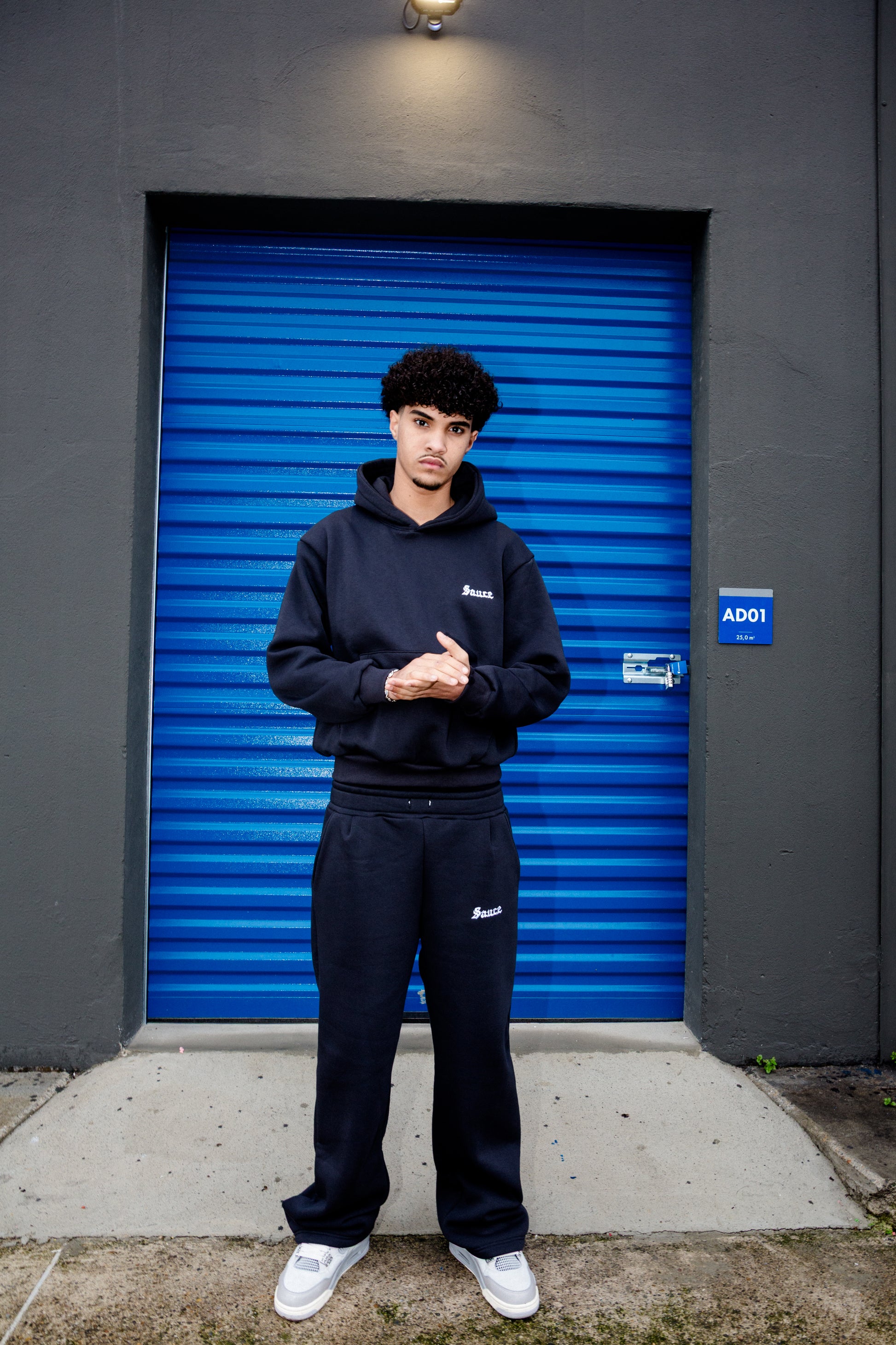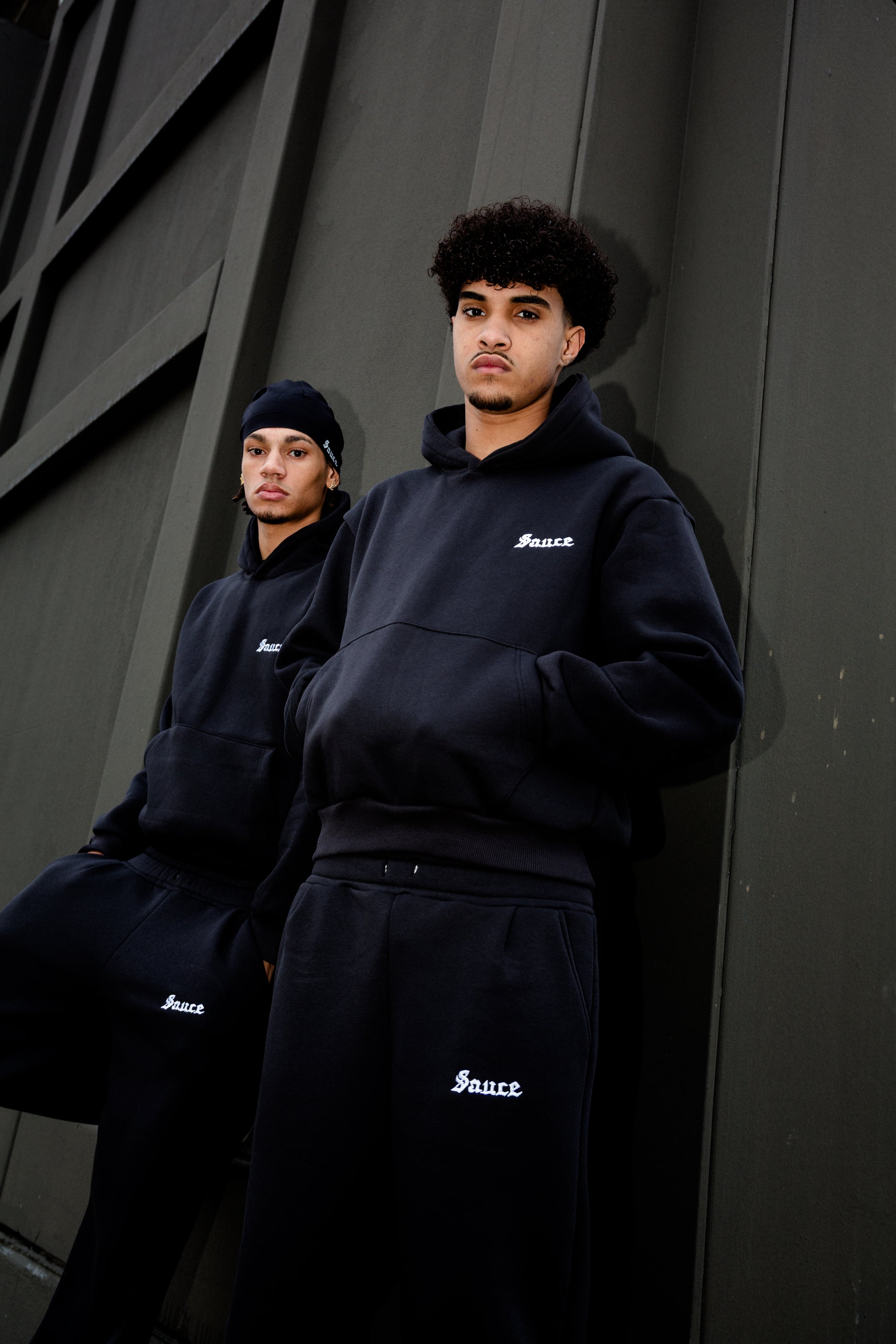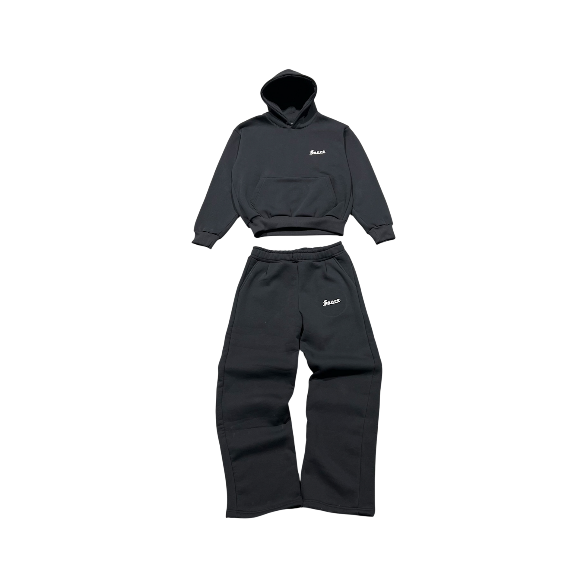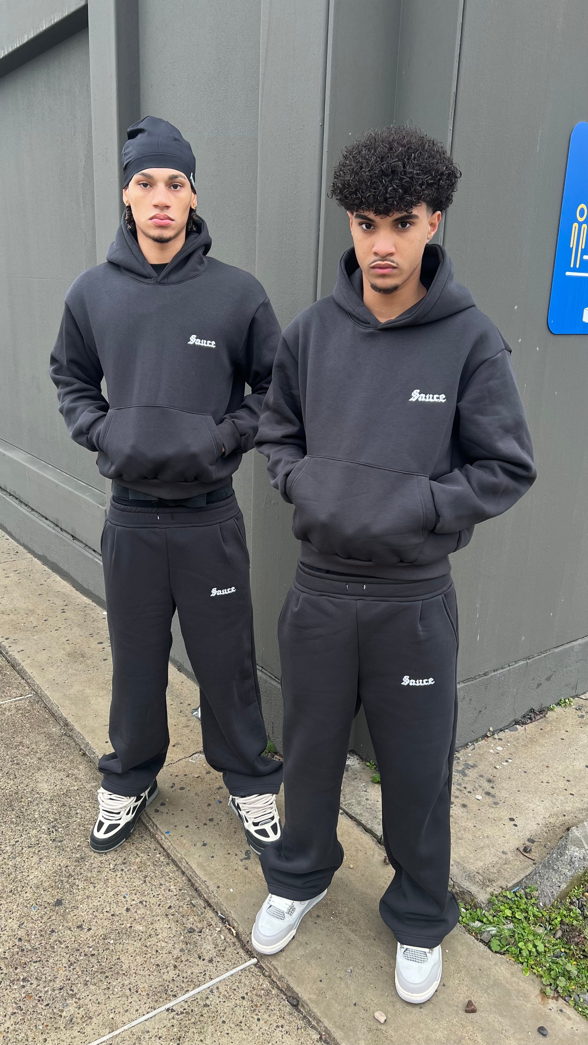 La tuta Sauce in grigio antracite unisce stile essenziale e comfort totale. Felpa con cappuccio e tasca frontale, pantaloni a gamba larga e vita elasticizzata. Materiale pesante e resistente per un fit premium. Logo ricamato bianco per un tocco minimal.