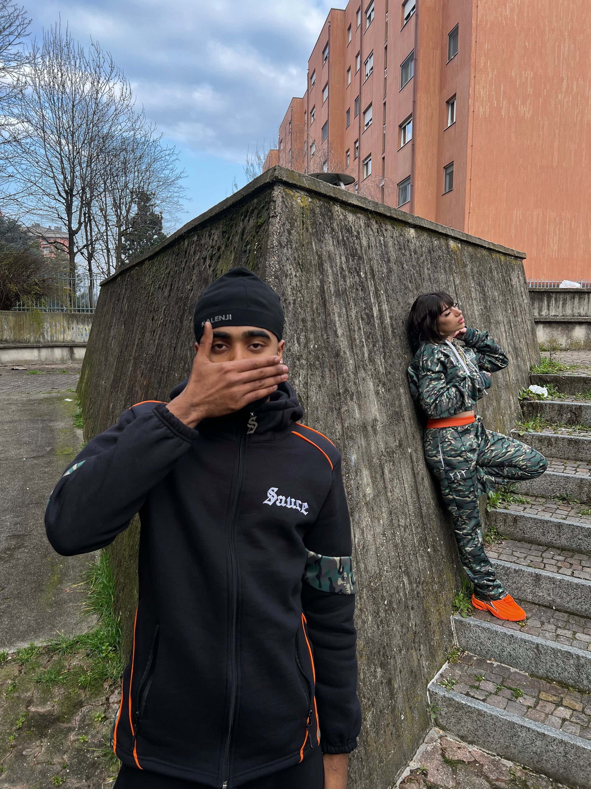 Tuta nera dal design street tecnico con inserti camo verde militare che danno carattere e movimento al capo. Linee pulite, dettagli curati e logo Sauce che rendono la tuta perfetta per chi vuole uno stile deciso ma pulito.